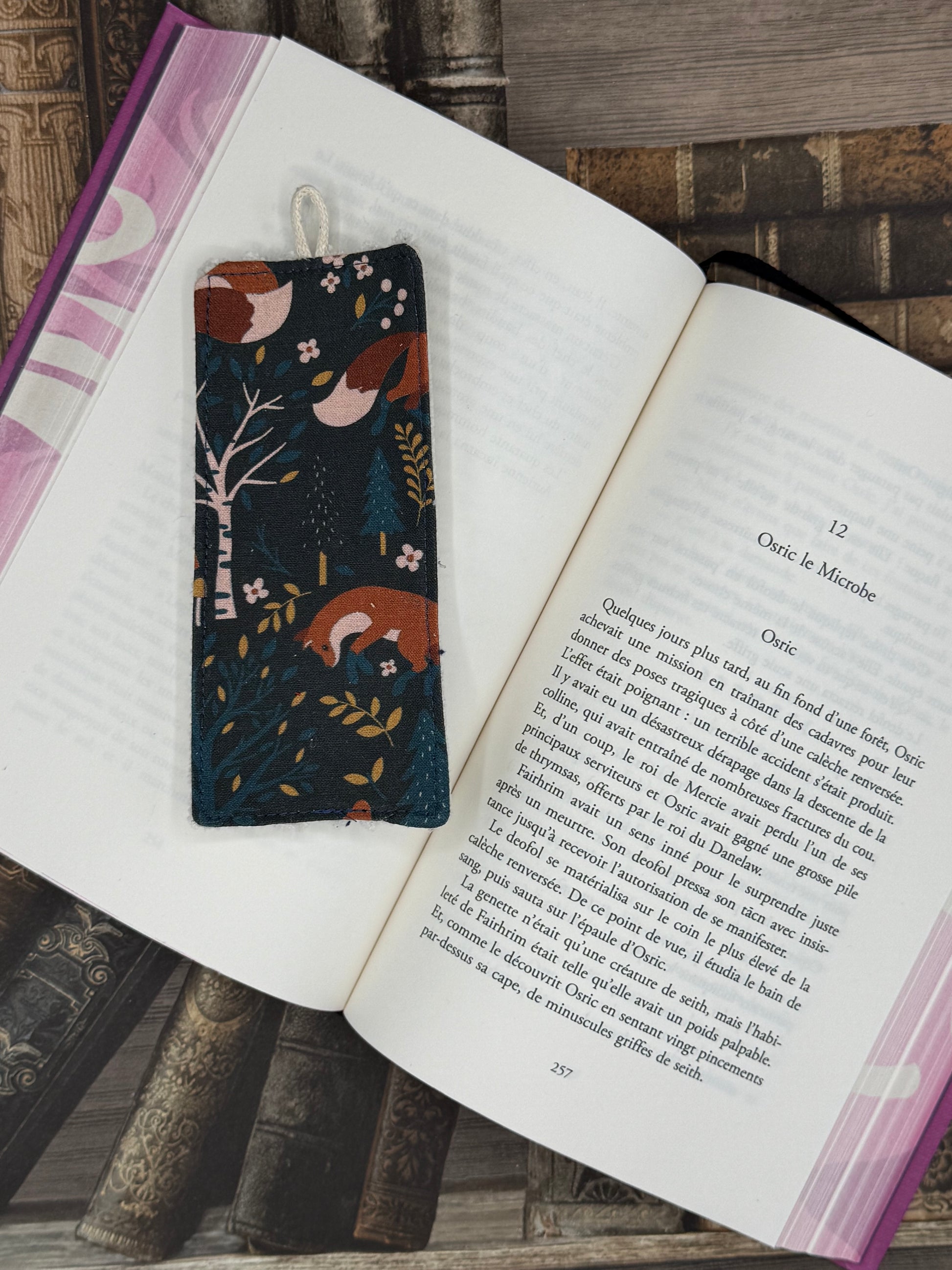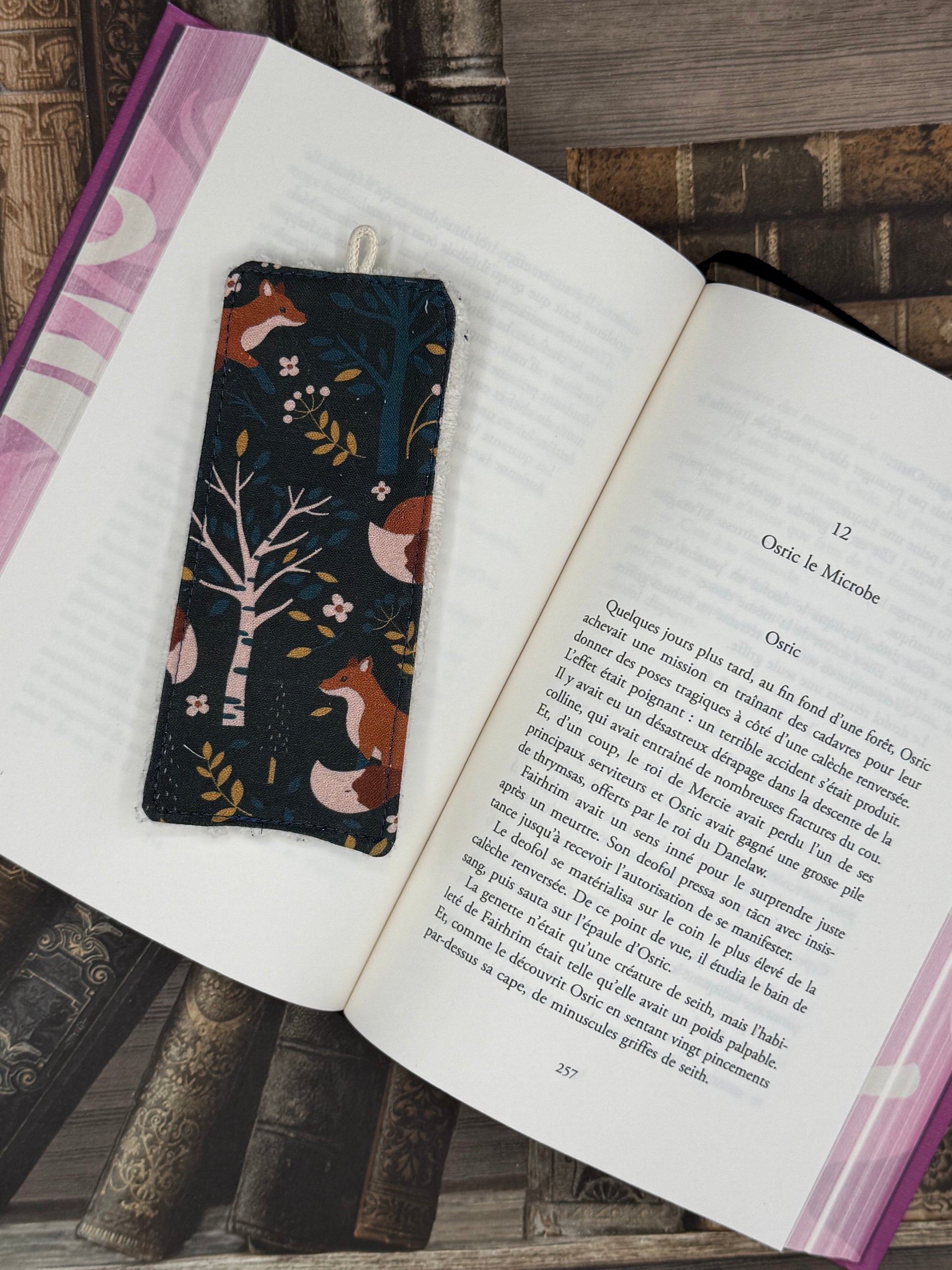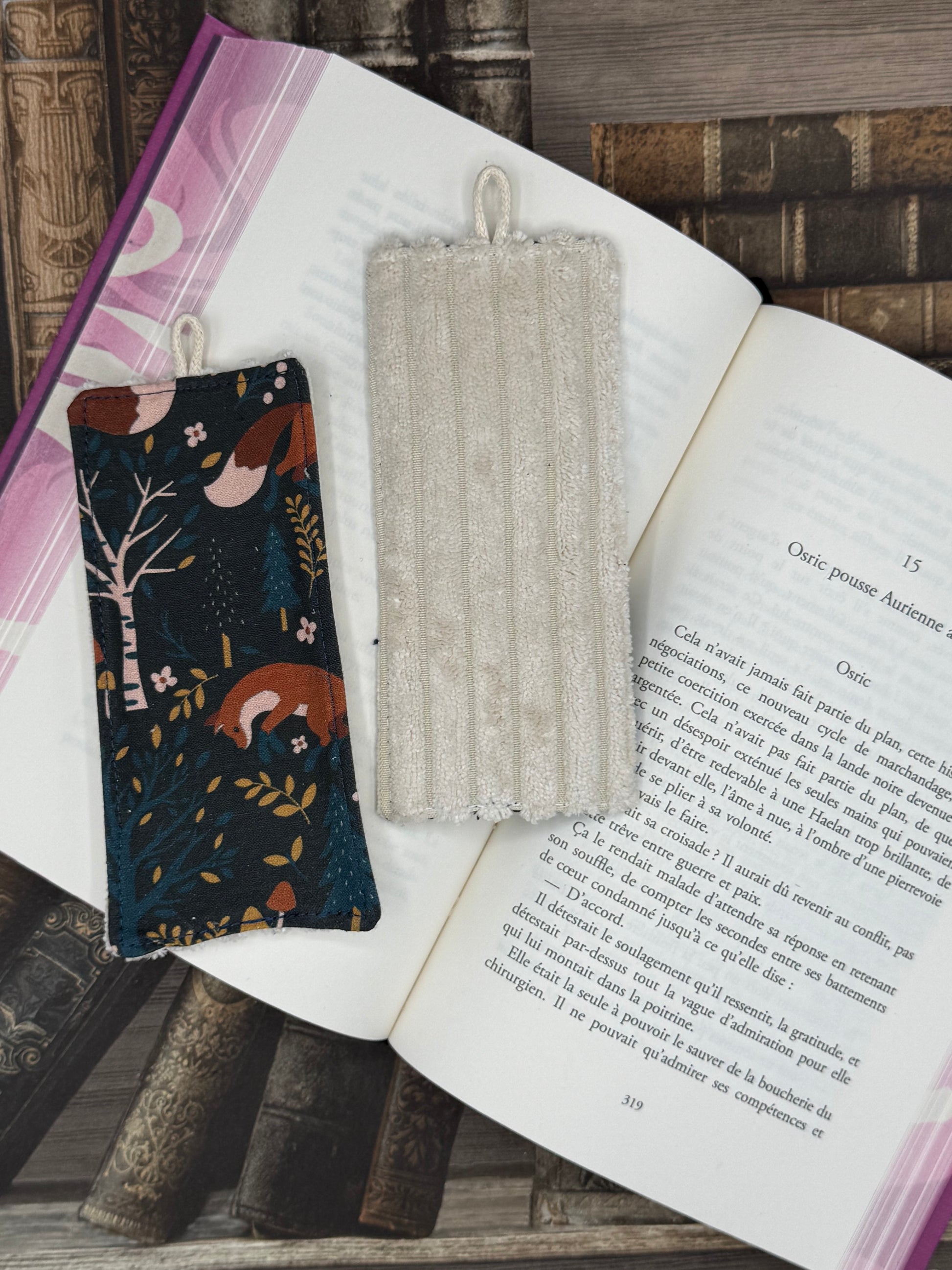 Joli marque page alliant velours et coton. Ces marques pages sont réalisés à partir de chute de tissus afin de les valoriser.