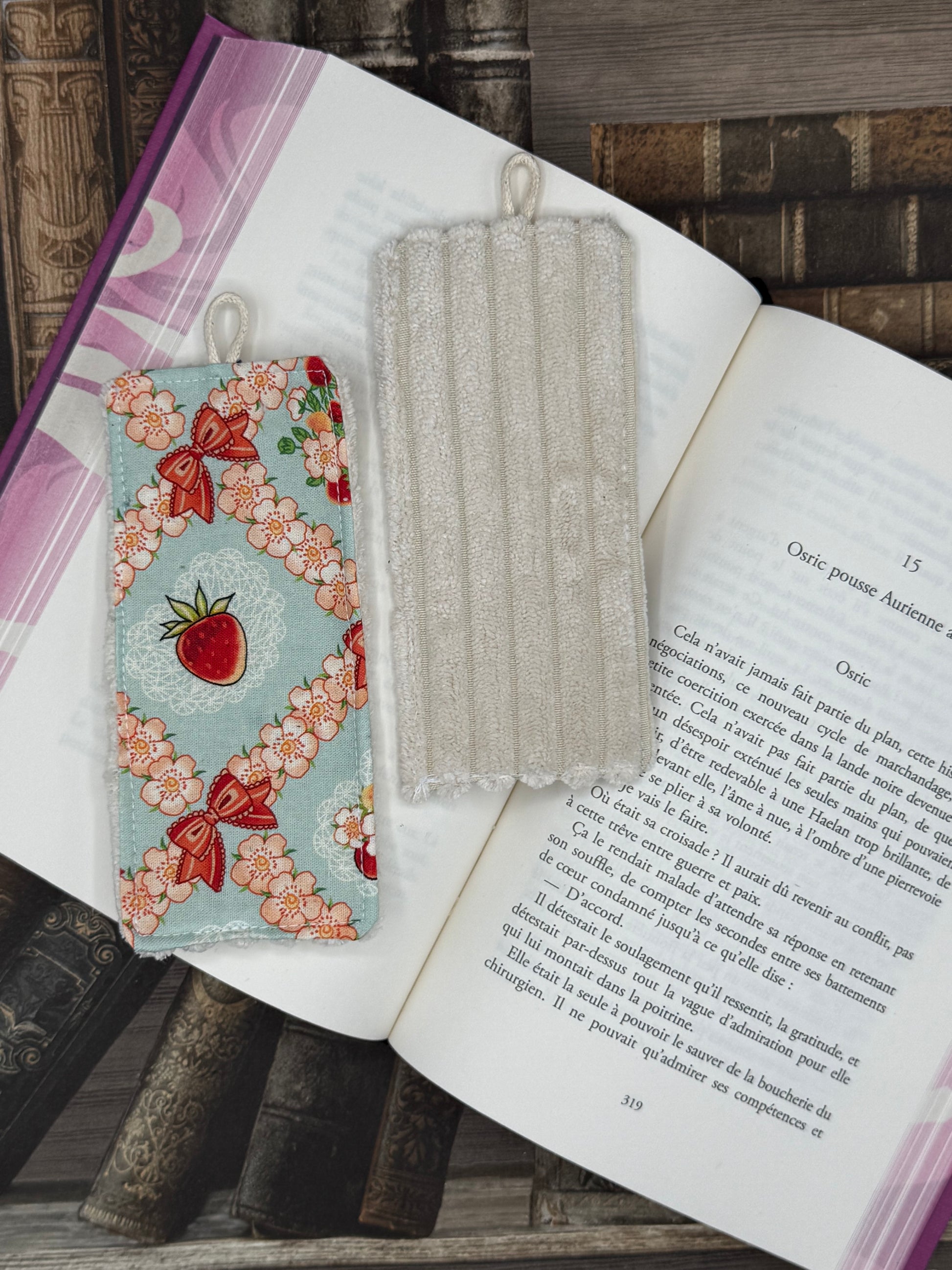 Joli marque page alliant velours et coton. Ces marques pages sont réalisés à partir de chute de tissus afin de les valoriser.