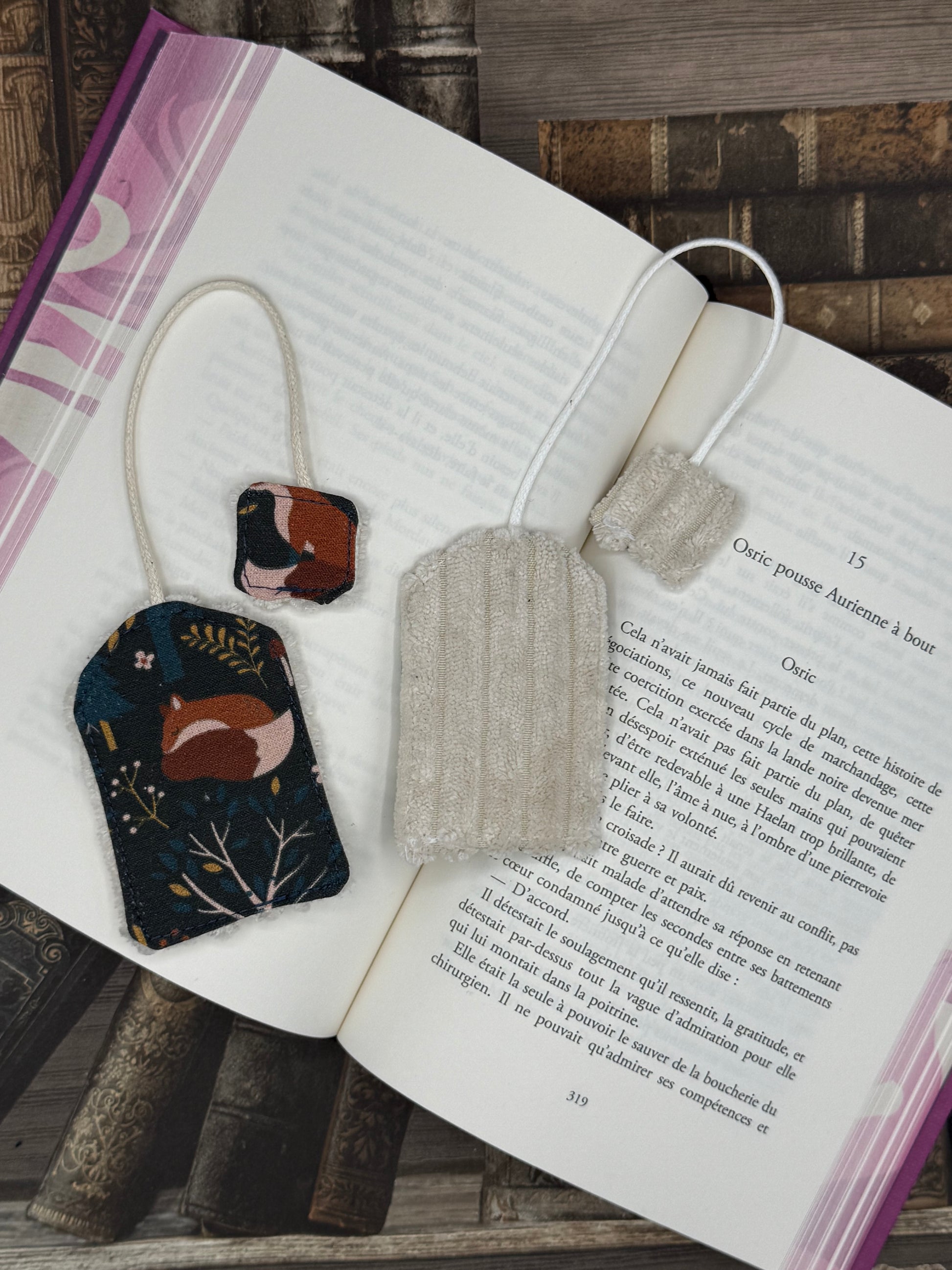 Joli marque page en forme de sachets de thé alliant velours et coton. Ces marques pages sont réalisés à partir de chute de tissus afin de les valoriser.
