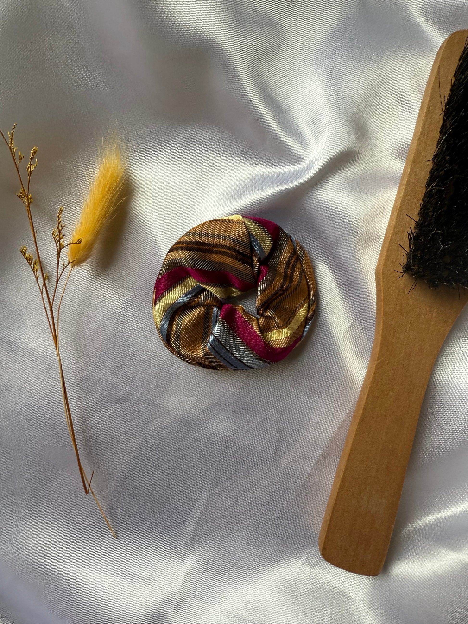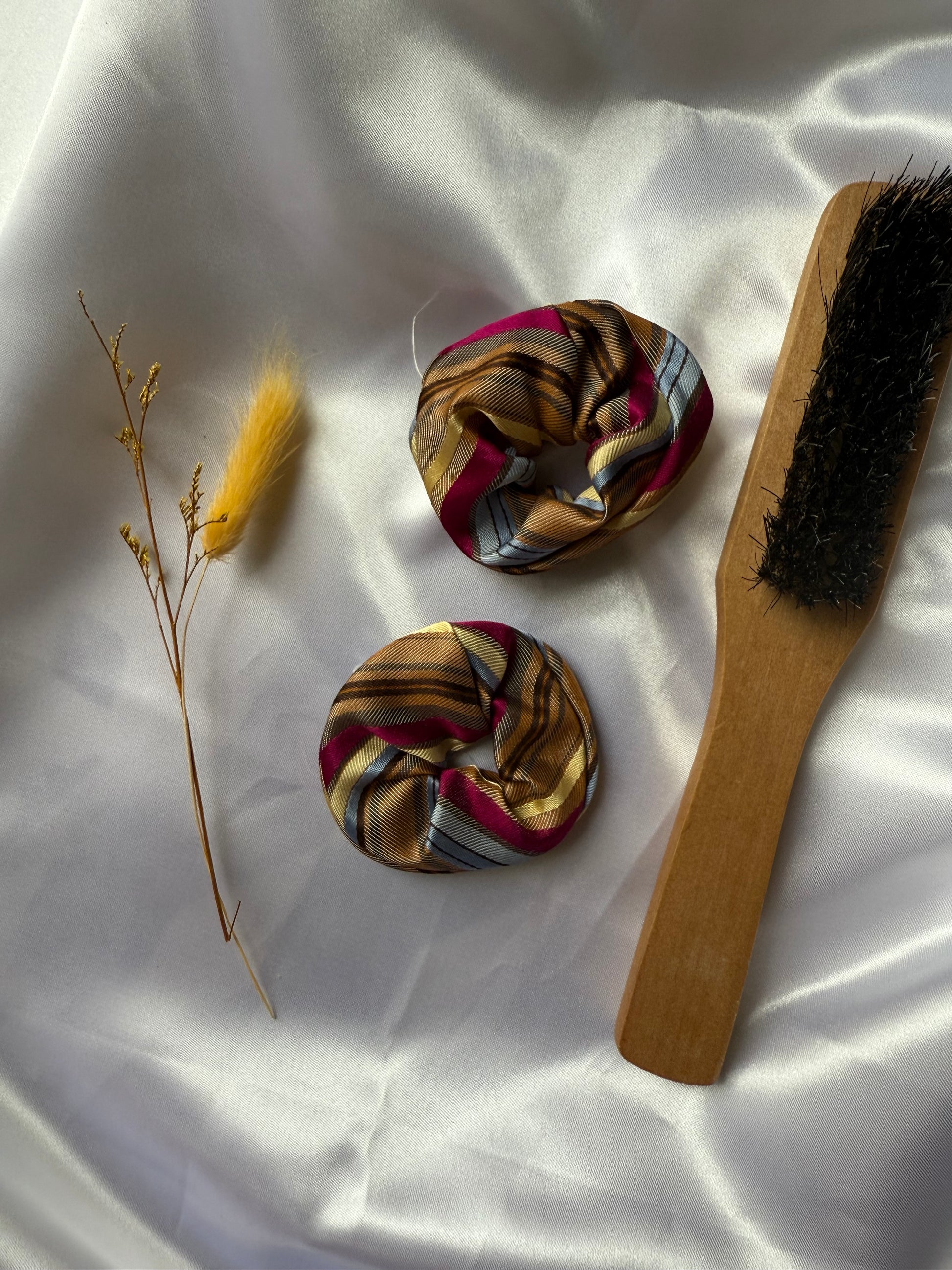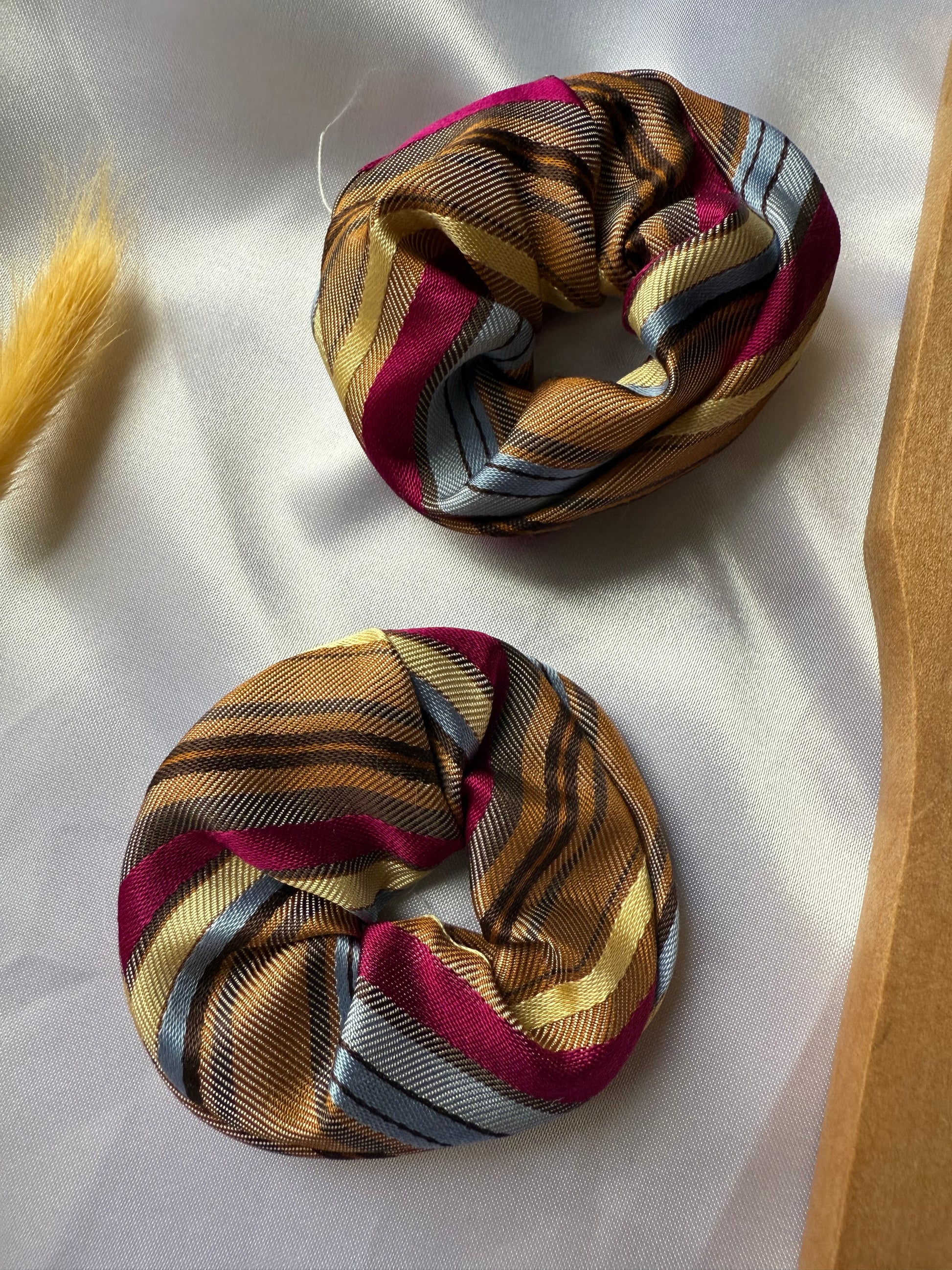 Choisissez parmi un mini chouchou ou un duo de chouchous en soie haut de gamme. C'est un accessoire incontournable pour les cheveux. Réalisé à la main avec amour grâce à une cravate upcyclée.